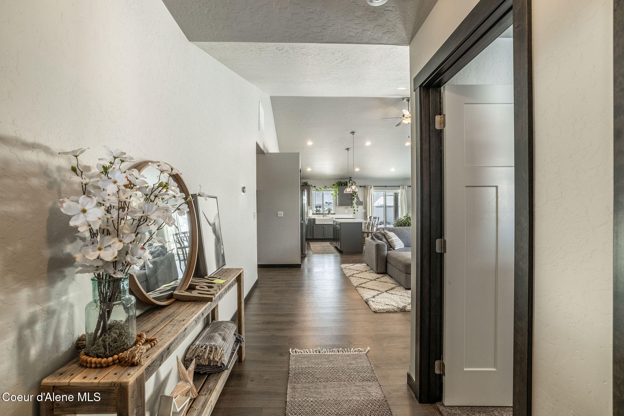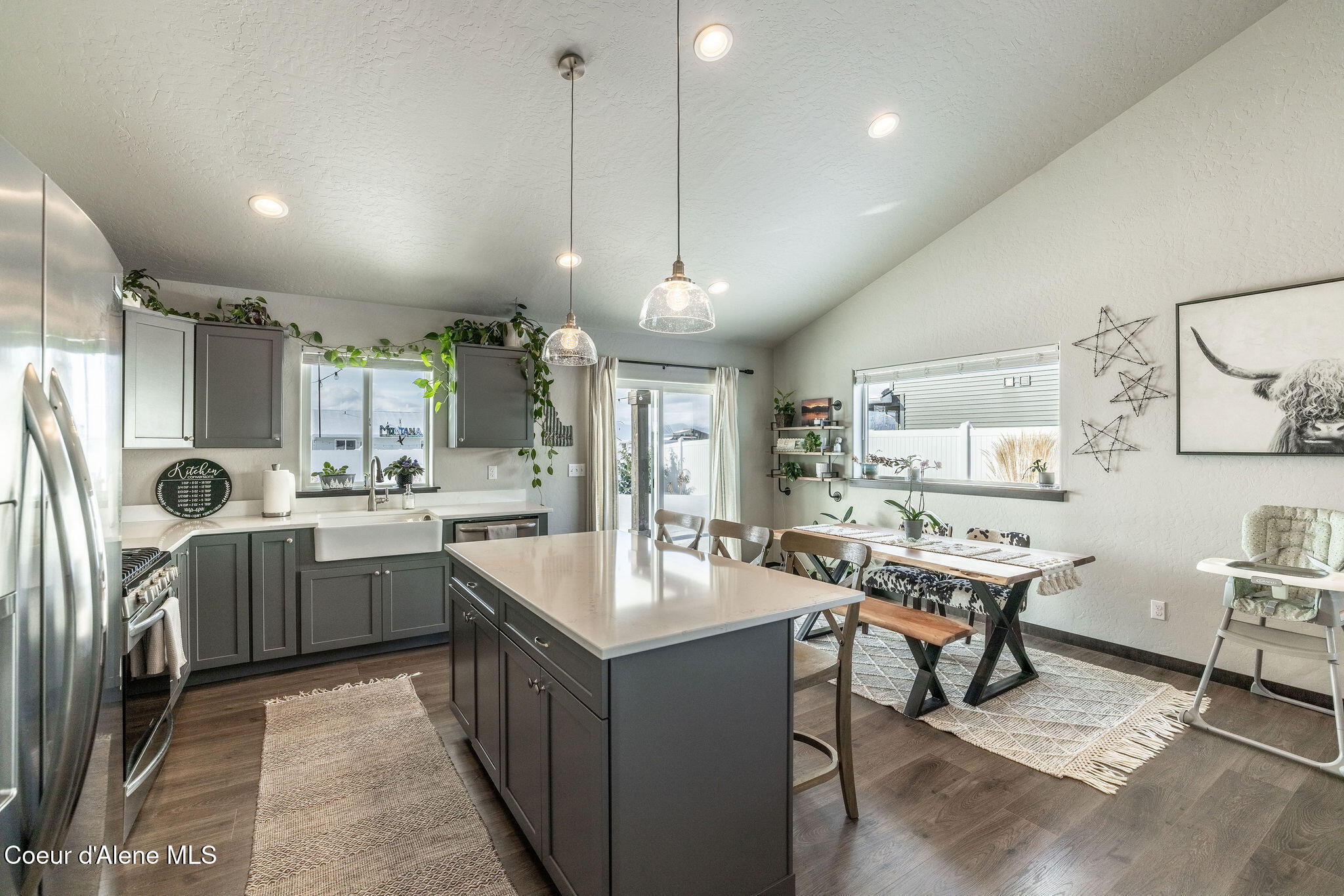 Welcome Home! No need to wait for new construction. Built 4 years ago, this clean and well-kept home features a stainless-steel gas range, microwave/hood vent, dishwasher large island, quartz countertops and a white farm sink in the kitchen. The gas fireplace with stacked stone will keep you warm during winter and the central A/C will keep you cool in the summer. Enjoy amazing sunsets from your large covered back patio with no back yard neighbors. Custom landscaping includes full sprinkler system, concrete flower bed curbing around the front and back as well as a beautiful Japanese Maple tree and full fencing. Large primary suite includes a walk-in shower, walk-in closet and dual sink vanity. Plenty of closets and storage complete this move-in ready home. Centrally located just a few minutes drive to Highway 41, Lancaster and Prairie Ave, this location makes for an easy commute to Rathdrum, Post Falls and Coeur d' Alene.